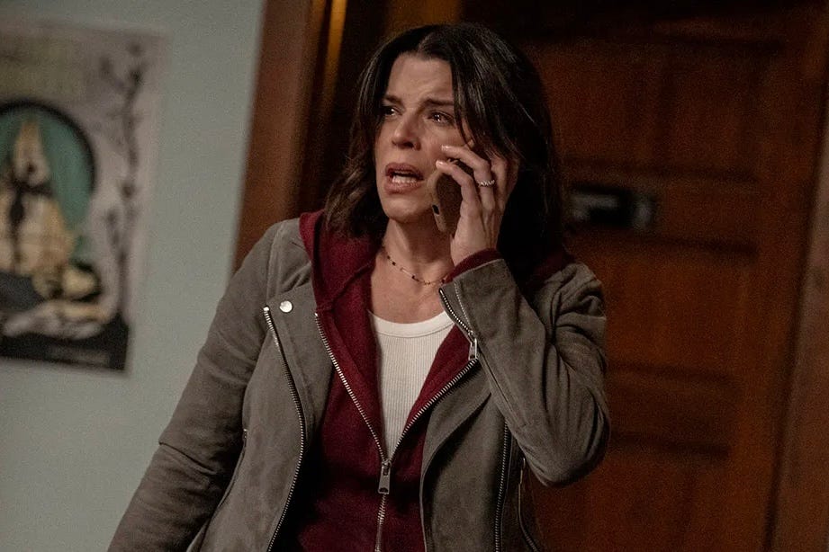 By now we know the structural beats so well they could be MadLibs, and after the obligatory self-reflexive cold open, our sweet Sidney — now a suburban mom running a coffee shop in Indiana — gets a menacing video call from a middle-aged Matthew Lillard, who we all thought she’d killed by dropping a TV on his head at the end of the 1996 original. Nobody takes seriously the idea that the character could have survived. The call is quickly pegged as AI trickery used by the killer to confuse Sidney and by the filmmakers to cram in a bunch of cameos from dead fan favorites who could cost-effectively Zoom in their performances.